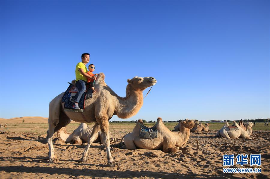 7月25日,一對父子在庫布其沙漠七星湖景區(qū)體驗騎駱駝。