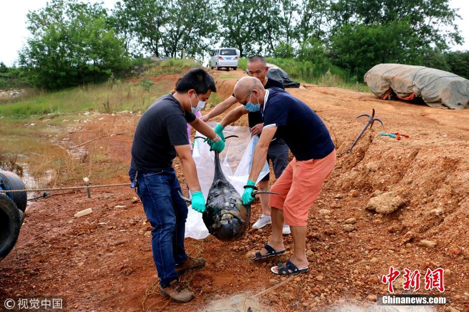 當(dāng)日16時(shí)許,中科院武漢水生所專家趕到現(xiàn)場(chǎng),經(jīng)解開(kāi)江豚身上的絲網(wǎng)發(fā)現(xiàn),這頭雄性成年江豚身體無(wú)明顯外傷,體重約35公斤,體長(zhǎng)1.38米。該水生所段姓研究員判斷,該頭江豚應(yīng)該是被絲網(wǎng)纏住身體后無(wú)法掙脫,不能躍出水面呼吸最后導(dǎo)致溺亡,非常可惜。當(dāng)天下午,水生所專家將這頭死亡江豚帶回解剖并制作標(biāo)本。洪永林 攝 圖片來(lái)源:視覺(jué)中國(guó) 文字來(lái)源:九江新聞網(wǎng)