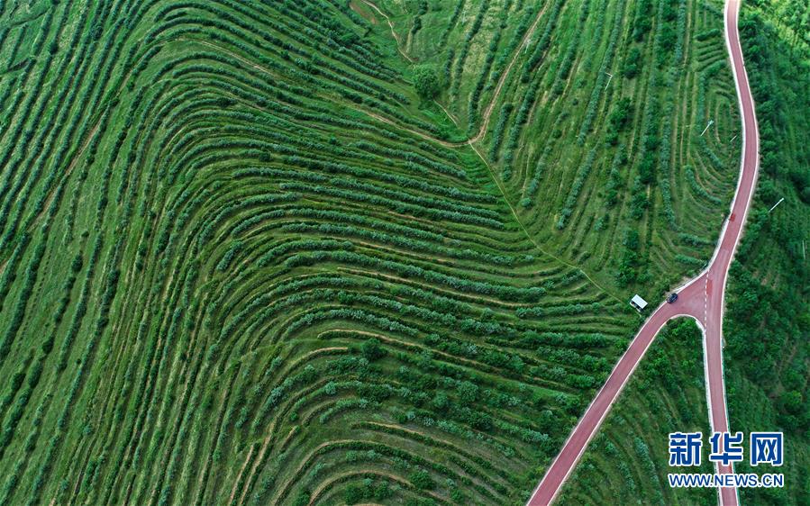 寧夏固原市彭陽(yáng)縣金雞坪梯田公園(7月16日無(wú)人機(jī)拍攝)。新華社記者 王鵬 攝