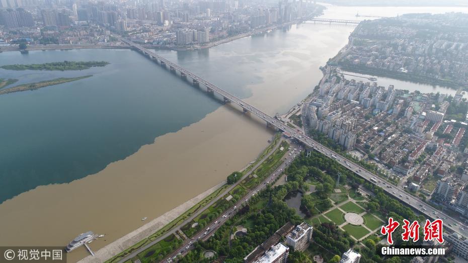 7月10日,航拍長江與南京秦淮河交匯處,江水與河水“涇渭分明”。當(dāng)日,江蘇水利廳發(fā)布的水情信息顯示,長江南京段水位已降至警戒線以下。中新社記者泱波 攝