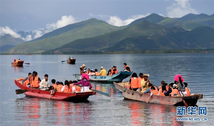 游客在瀘沽湖上坐船游覽(7月30日攝)。如今寧蒗永寧鄉(xiāng)落水村的摩梭群眾靠旅游服務實現(xiàn)脫貧致富。 新華社記者 藺以光攝