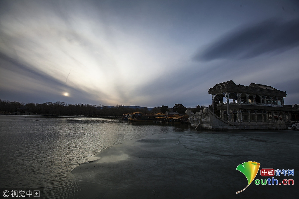 2018年2月23日,北京頤和園。當天日落時分昆明湖上空出現(xiàn)夕陽余暉的美景,夢幻般的色彩將古老的皇家園林裝扮得美輪美奐,讓人流連忘返。