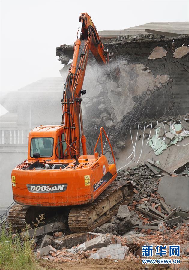 9月6日,施工人員在對(duì)拆除中的別墅進(jìn)行噴淋降塵作業(yè)。 新華社記者 邵瑞 攝