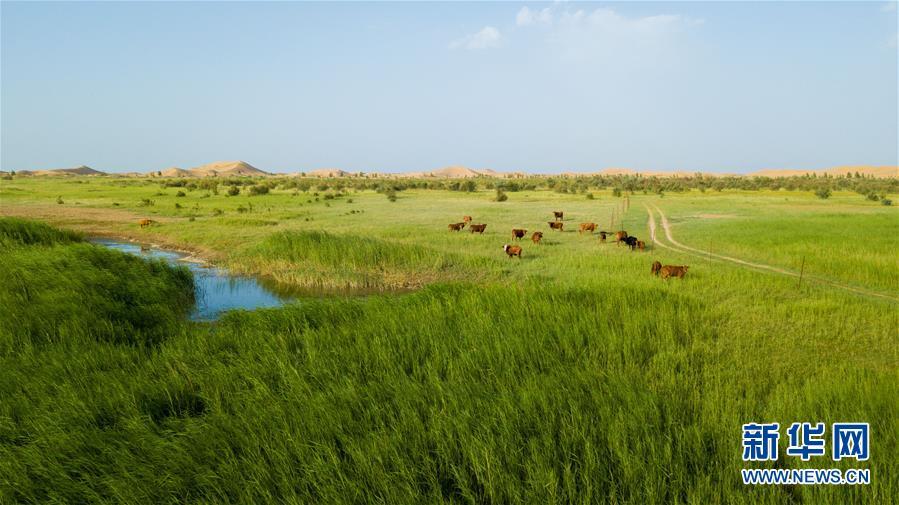 內(nèi)蒙古杭錦旗位于庫布其沙漠中的生態(tài)修復(fù)景觀(7月11日無人機(jī)拍攝)。 新華社記者彭源攝