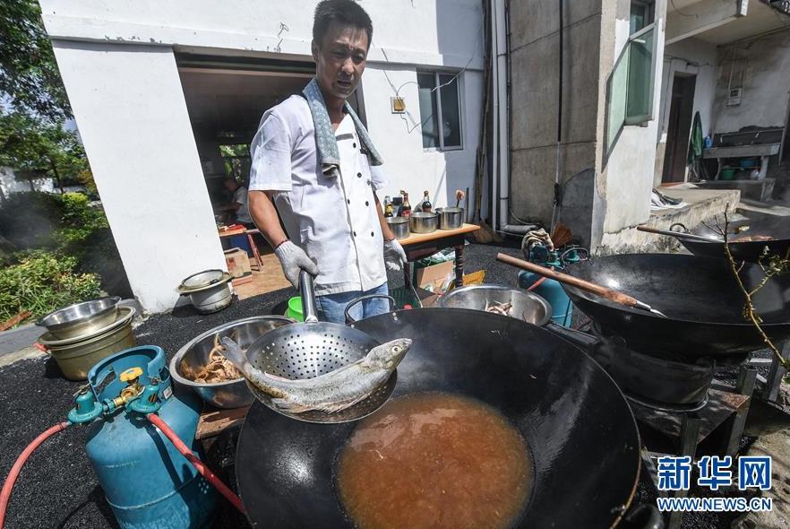 9月18日,村民在烹飪剛剛捕撈上來(lái)的江鮮。