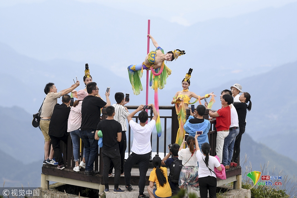 2018年9月20日,中秋節(jié)前夕,位于長(zhǎng)三角第一高峰海拔1929米的浙江龍泉山頂,一場(chǎng)柔美的鋼管舞表演吸引了眾人圍觀。
