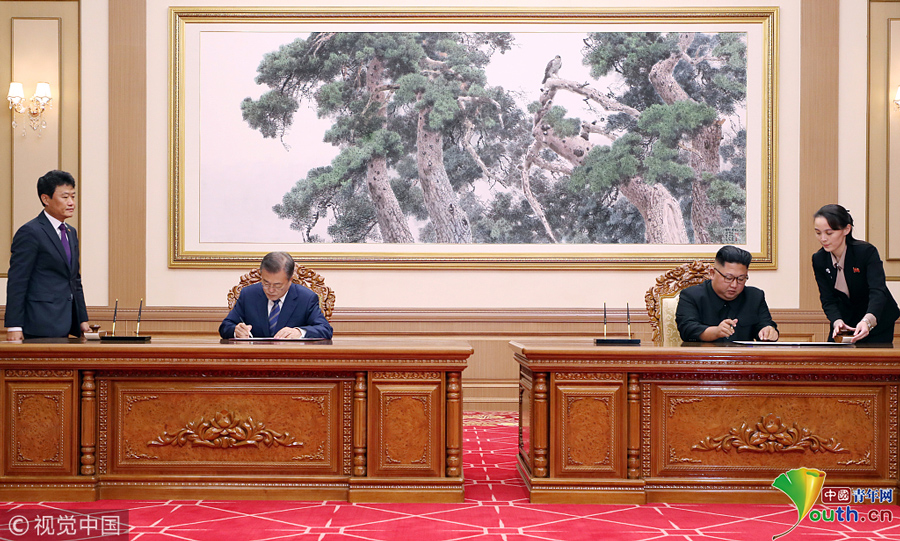 朝鮮最高領(lǐng)導(dǎo)人金正恩和韓國(guó)總統(tǒng)文在寅舉行第三次會(huì)晤的第二輪首腦會(huì)談。圖片作者:Yonhap News Agency