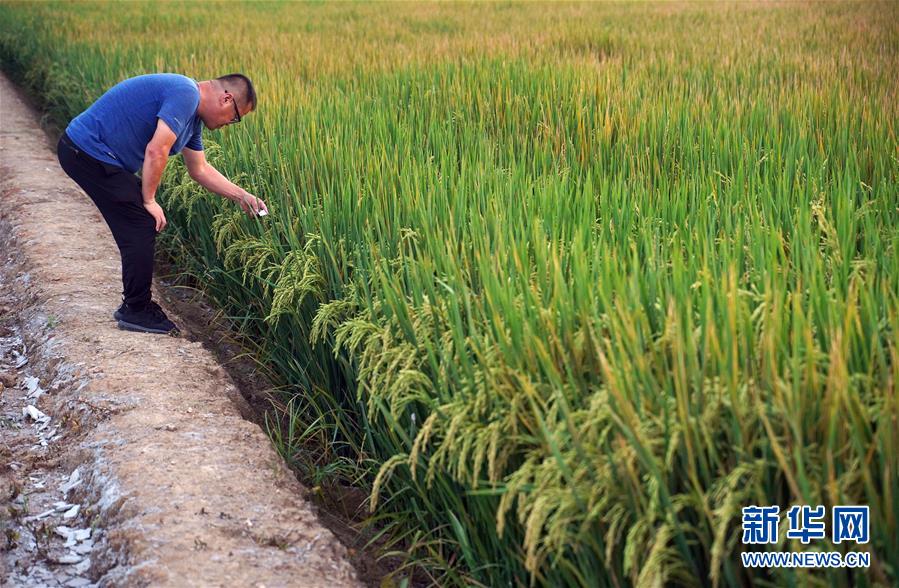 9月15日,北大荒集團七星農(nóng)場駐小崗村技術負責人趙明武在小崗村的北大荒集團現(xiàn)代化水稻生產(chǎn)基地檢查生物殺蟲卡。新華社記者才揚攝
