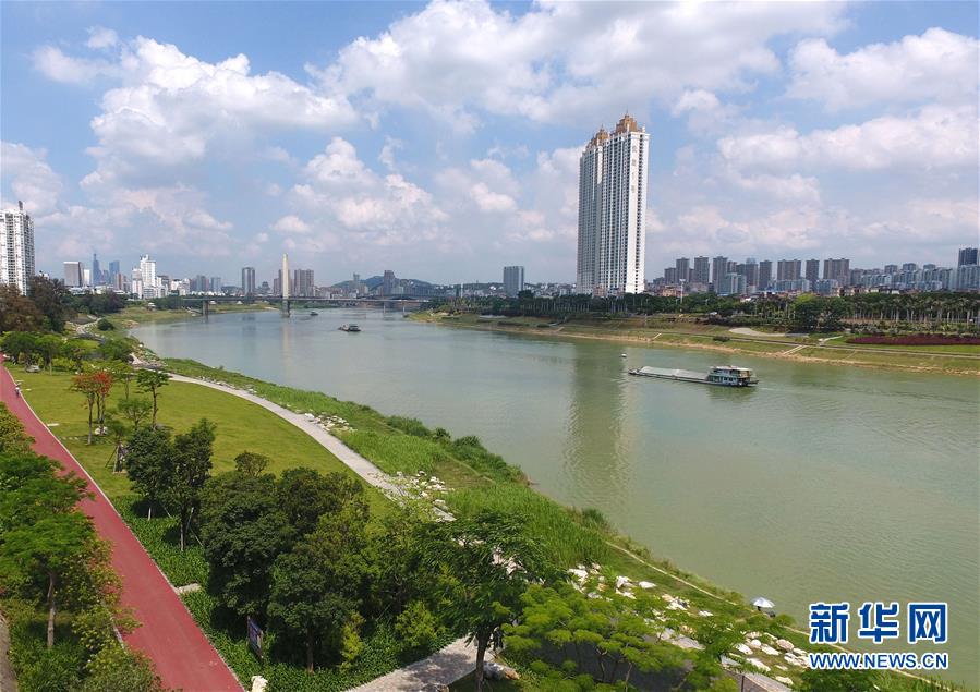 這是船舶在西江黃金水道邕江南寧段航行(5月20日攝,無人機航拍)。 新華社記者 周華 攝