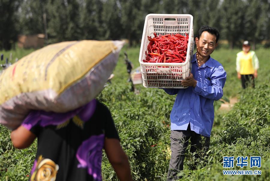 9月16日,阜城縣王集鄉(xiāng)南張莊村農(nóng)民在搬運采摘的辣椒。近年來,河北省阜城縣王集鄉(xiāng)在推進產(chǎn)業(yè)富民過程中,積極引導(dǎo)農(nóng)民調(diào)整農(nóng)業(yè)產(chǎn)業(yè)結(jié)構(gòu),按照品種特色化、種植規(guī)?;?、產(chǎn)銷一體化的“公司+基地+農(nóng)戶”的經(jīng)營模式,鼓勵農(nóng)民發(fā)展特色辣椒種植,推行“訂單種植”模式,開辟出了一條農(nóng)民創(chuàng)收新路徑。目前,阜城縣王集鄉(xiāng)辣椒種植面積3100余畝,每畝年收益2500元以上,帶動當(dāng)?shù)剞r(nóng)民實現(xiàn)增收。新華社記者朱旭東攝