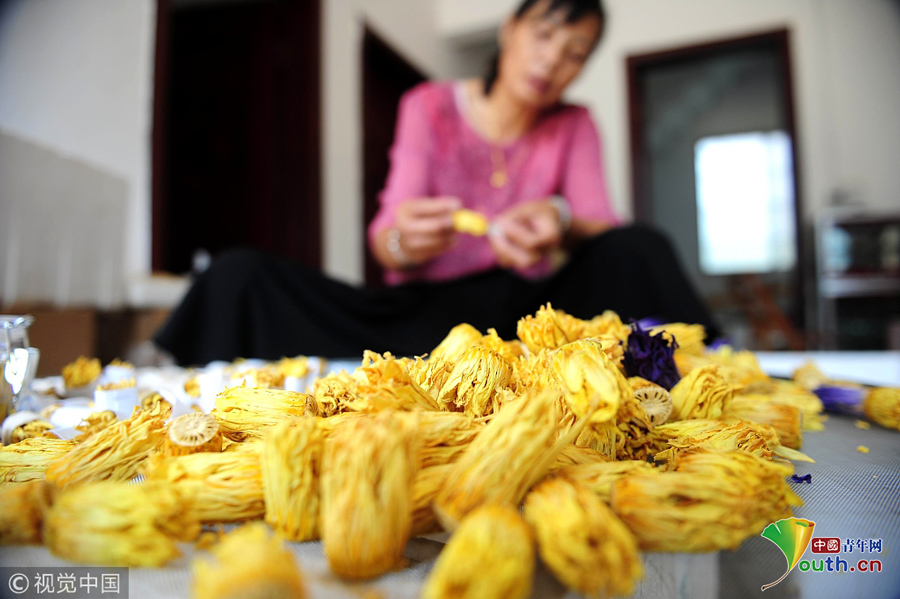 2018年9月23日,廣西柳州,柳北區(qū)石碑坪鎮(zhèn)下陶村的農(nóng)民覃向鮮在分揀已經(jīng)晾曬干了的九品香蓮。圖片作者:陳健明