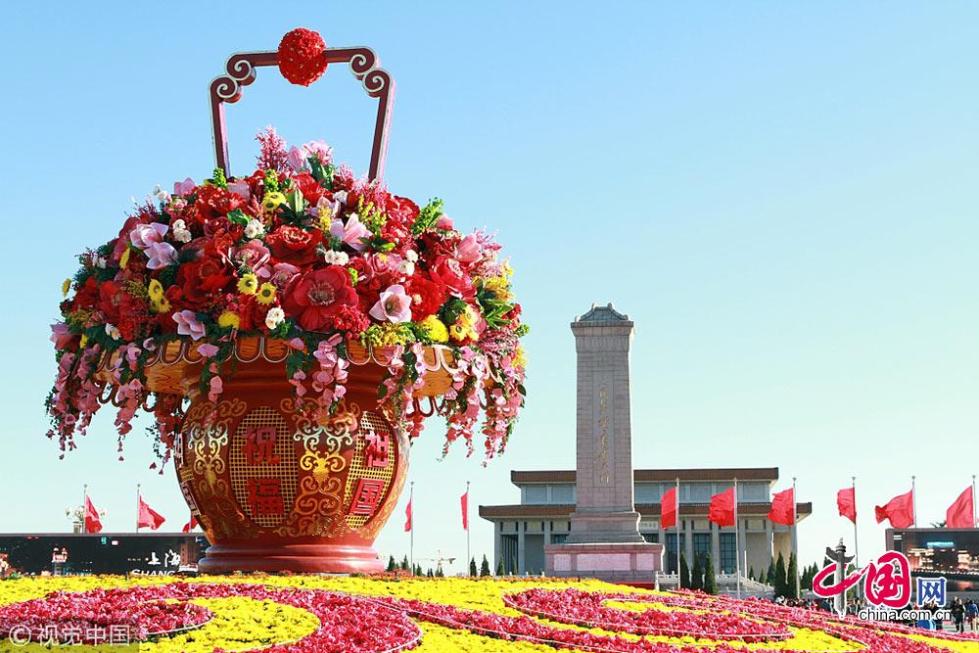 2011年10月04日,在北京蔚藍(lán)的天空下,“祝福祖國(guó)”的大型花壇屹立在天安門(mén)廣場(chǎng)中央。蘇陽(yáng)攝影