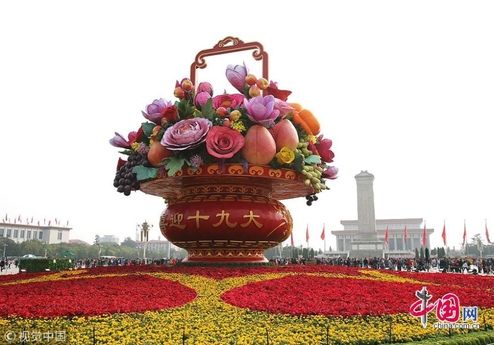 2017年天安門(mén)廣場(chǎng)大花籃以喜慶的花果籃為主景,花籃頂高17米,籃體高15.3米,底部直徑達(dá)50米?;@體南側(cè)寫(xiě)有“祝福祖國(guó)、1949-2017”,北側(cè)寫(xiě)有“喜迎十九大” 字樣。花果籃內(nèi)共使用主花56朵(牡丹、月季、玉蘭、金桂、迎春花、蘋(píng)果花、紫藤花、文心蘭、葉子花),其中最大牡丹直徑3.2米,果實(shí)6種(石榴、桃、柿子、蘋(píng)果、海棠、葡萄)。寓意吉祥的果實(shí)和花卉,象征十八大以來(lái),黨和國(guó)家在各個(gè)領(lǐng)域取得的輝煌成就,碩果累累。底部花壇采用心形圖案,寓意紅心向黨,象征著全國(guó)人民緊密團(tuán)結(jié)在以習(xí)近平同志為核心的黨中央周?chē)?,表達(dá)對(duì)祖國(guó)繁榮富強(qiáng)、欣欣向榮的美好祝福。