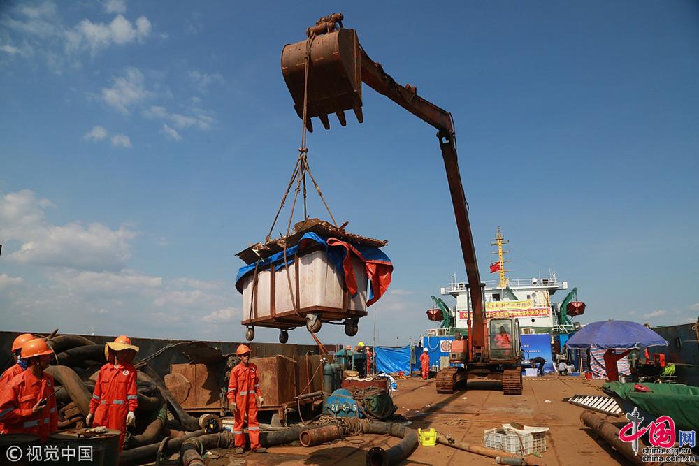 2018年9月25日,遼寧大連,考古工作人員把出水的經(jīng)遠(yuǎn)艦遺物進(jìn)行轉(zhuǎn)運(yùn)。視覺中國(guó)