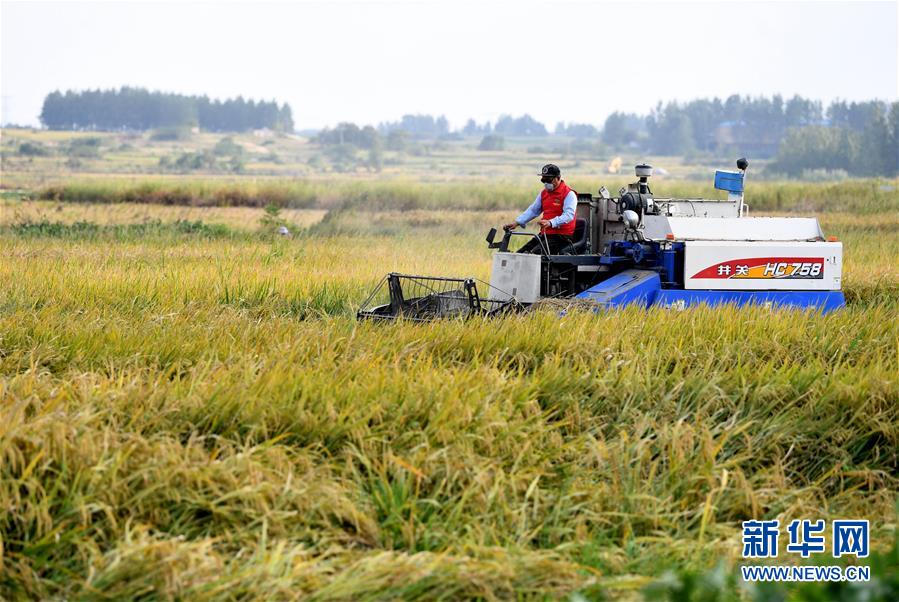9月27日,在鳳陽縣小崗村,農(nóng)民駕駛收割機(jī)收割水稻。新華社記者 劉軍喜 攝