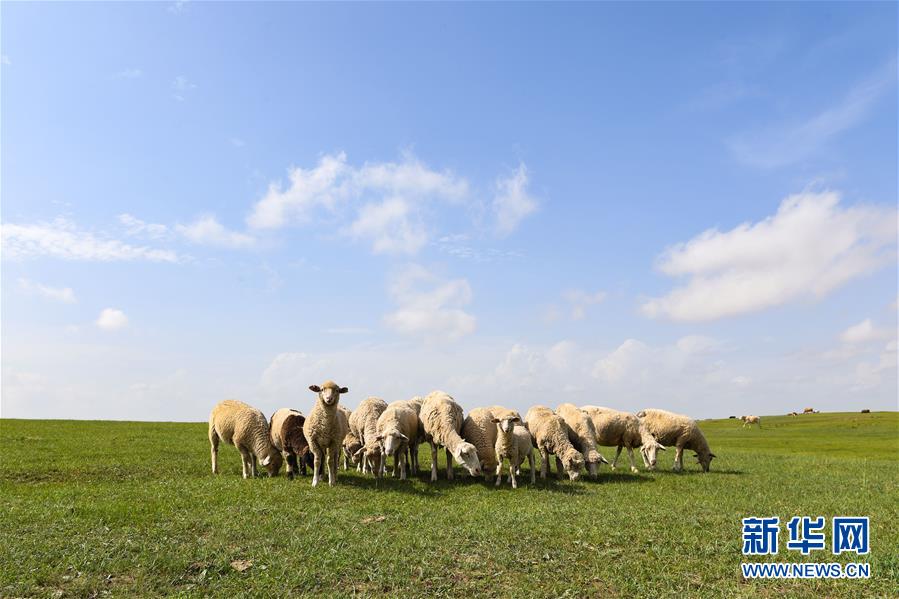 羊群在錫林郭勒盟正藍旗的草原上覓食(7月16日攝)。盛夏時節(jié),內蒙古錫林郭勒草原一碧千里,遙接天際。藍天白云之下,牛羊悠閑自在,馬群奔馳其中,風光旖旎。 新華社記者 劉磊 攝