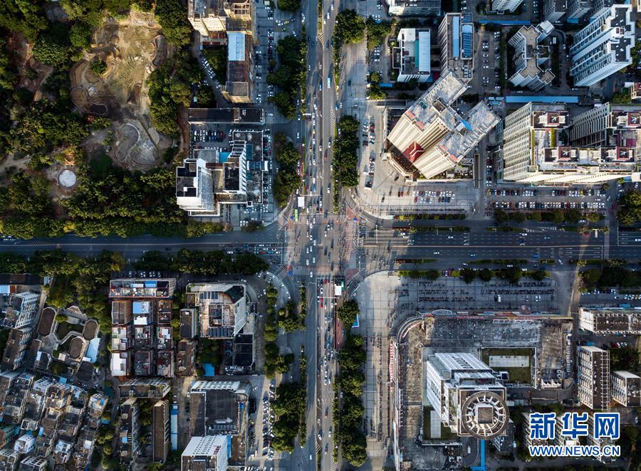 這是廣西北海市北海大道和北京路交匯處街景(9月27日無人機拍攝)。