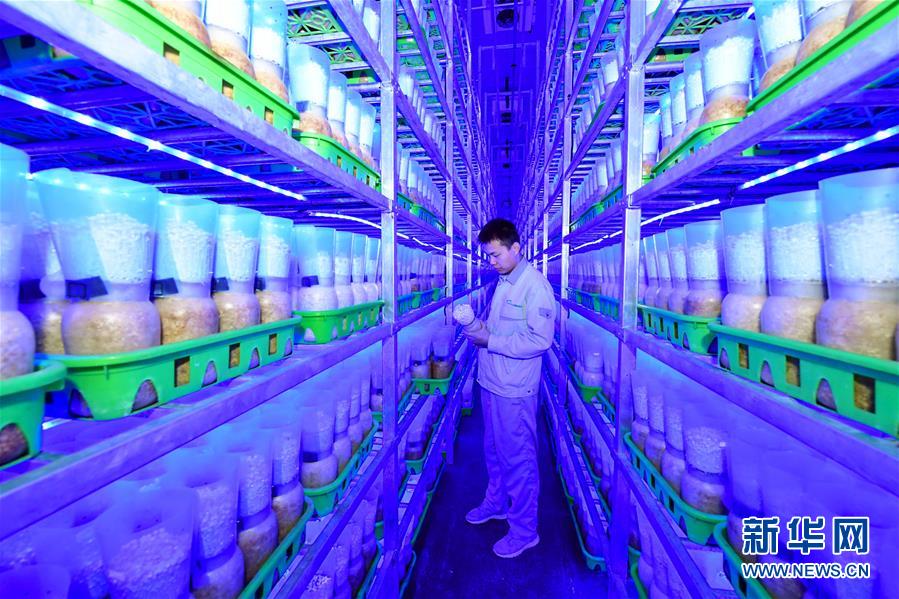 在位于清豐縣的河南龍豐實(shí)業(yè)股份有限公司,一名工人在車(chē)間查看金針菇的長(zhǎng)勢(shì)(9月28日攝)。