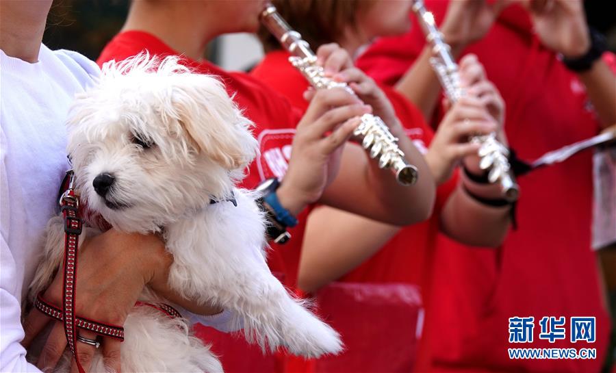 9月29日,在美國加利福尼亞州伯林蓋姆市,一支學(xué)生樂隊(duì)參加寵物狗大游行活動。美國加州舊金山灣區(qū)的伯林蓋姆市29日舉行寵物狗大游行活動。新華社記者吳曉凌攝