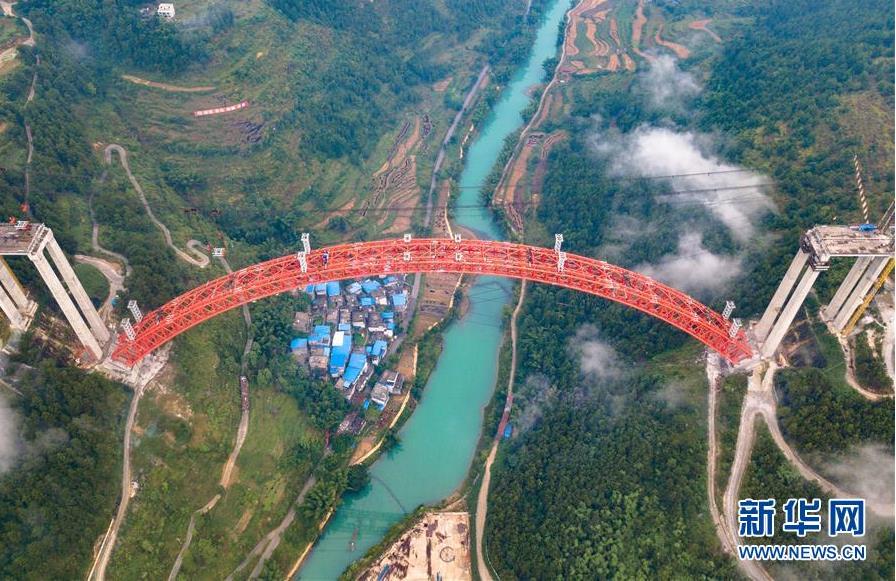 9月28日拍攝的川藏鐵路拉林段重點標志性工程藏木特大橋。 當(dāng)日,隨著最后一節(jié)鋼管拱的對位和鎖定完畢,川藏鐵路拉林段藏木特大橋成功合龍,標志著大橋主體結(jié)構(gòu)施工取得了關(guān)鍵性勝利。藏木特大橋由中國中鐵廣州局集團承建,拱高112米,橋橫跨雅魯藏布江峽谷,水深66米。 新華社記者普布扎西攝