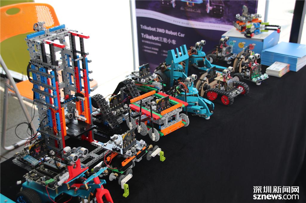 針對(duì)小朋友教育的小機(jī)器人可以自行組裝、編程,圖為展位前的教育小機(jī)器人