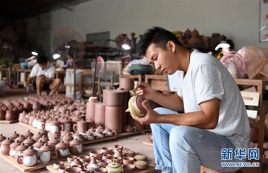10月9日,欽州市一家廣西坭興陶生產(chǎn)企業(yè)的員工在制作坭興陶產(chǎn)品。 新華社記者 陸波岸 攝