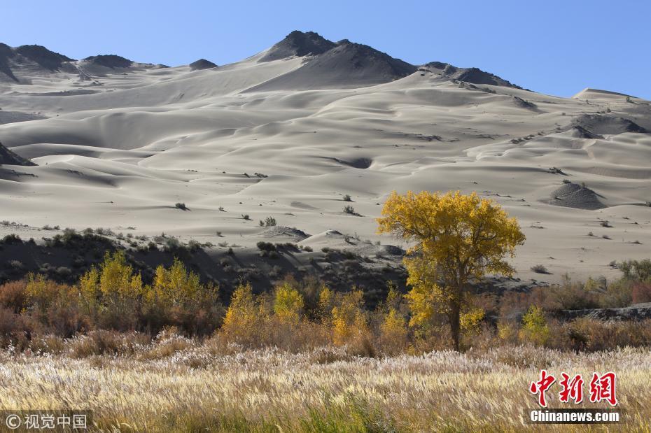 10月6日,甘肅酒泉,位于庫(kù)木塔格沙漠東緣的大峽谷被金黃的胡楊裝點(diǎn)出絢爛的秋色。 圖片來(lái)源:視覺(jué)中國(guó)