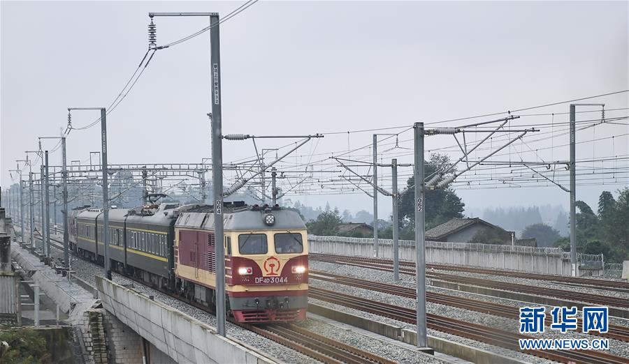 10月14日,試驗(yàn)列車在位于成都市蒲江縣境內(nèi)的成雅鐵路成朝段上行駛。新華社記者薛玉斌攝