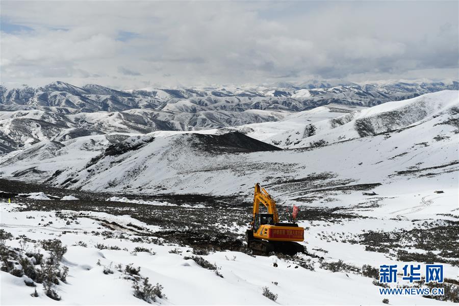 工作人員駕駛大型機(jī)械在昌都市江達(dá)縣的高山牧場(chǎng)上搶通道路(10月14日攝)。新華社記者 劉東君 攝
