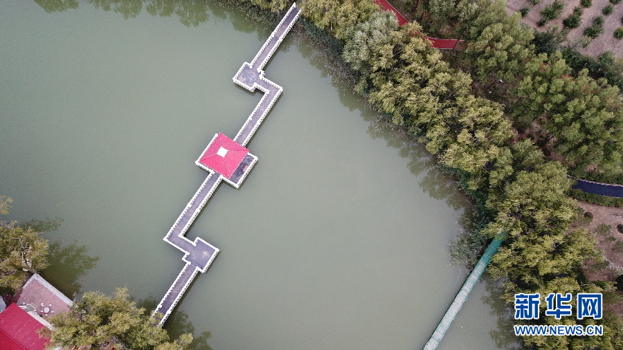 俯瞰恩格貝月亮湖。(新華網(wǎng) 王宇 攝)