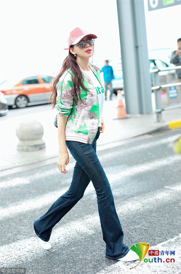 2018年10月16日,上海,林志玲亮相機(jī)場,她身穿綠色印花外套搭配粉色鴨舌帽十分清新靚麗,乖乖坐小車抿嘴甜笑比V嘟嘴頻賣萌。