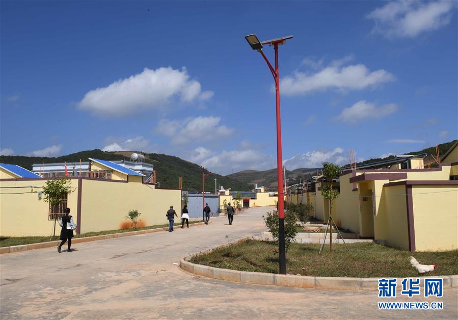 10月16日,人們行走在硯山縣小補佐村的道路上。 云南省文山壯族苗族自治州硯山縣稼依鎮(zhèn)小補佐村有55戶200多名壯族群眾曾經(jīng)居住在大山深處。2017年10月,在政府的幫扶下,小補佐村易地扶貧建設(shè)新村,村民全部搬遷入住新居。 新華社記者 楊宗友 攝
