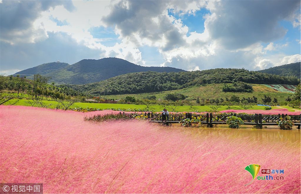 中國青年網北京10月7日電 2018年10月6日,游客在“粉色田野”里游玩、留影。粉黛亂子草是一種觀賞草種,該植物夏季為主要生長季,全株綠色,花期為9月中旬至11月中旬,開花時,綠葉為底,粉紫色花穗如發(fā)絲從基部長出,遠看如紅色云霧。