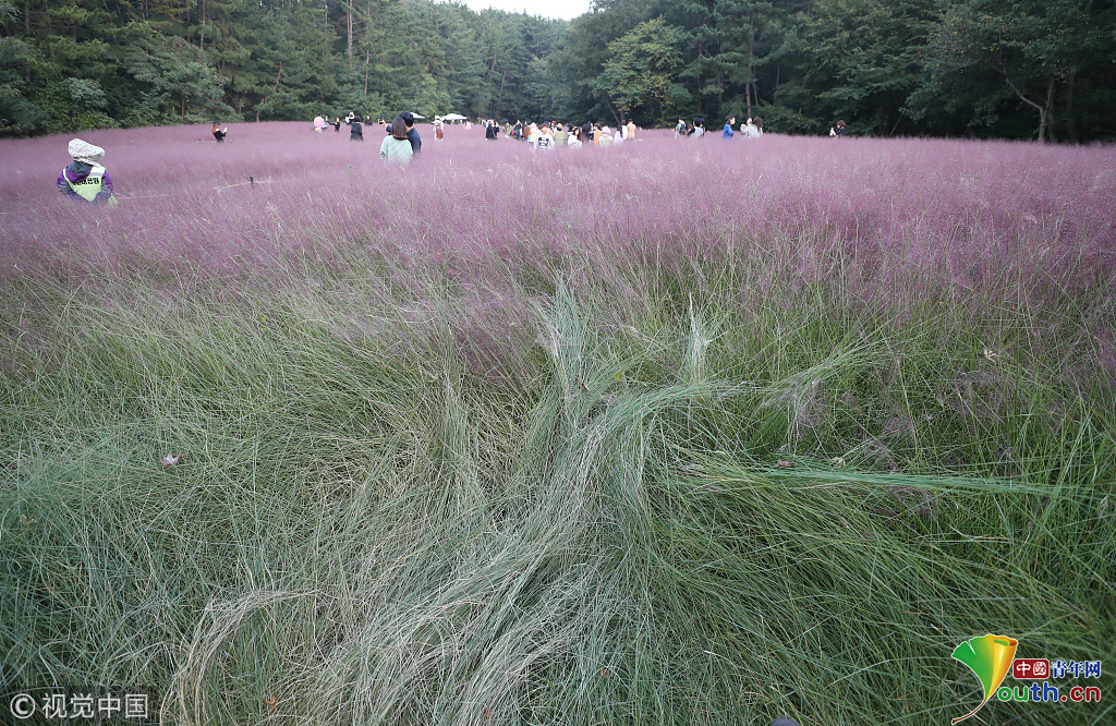 當?shù)貢r間2018年10月16日,韓國蔚山,近日,蔚山公園大片粉黛亂子草盛開,粉紅花海浪漫十足,但部分花海遭游客隨意踩踏。圖片作者:Yonhap News Agency