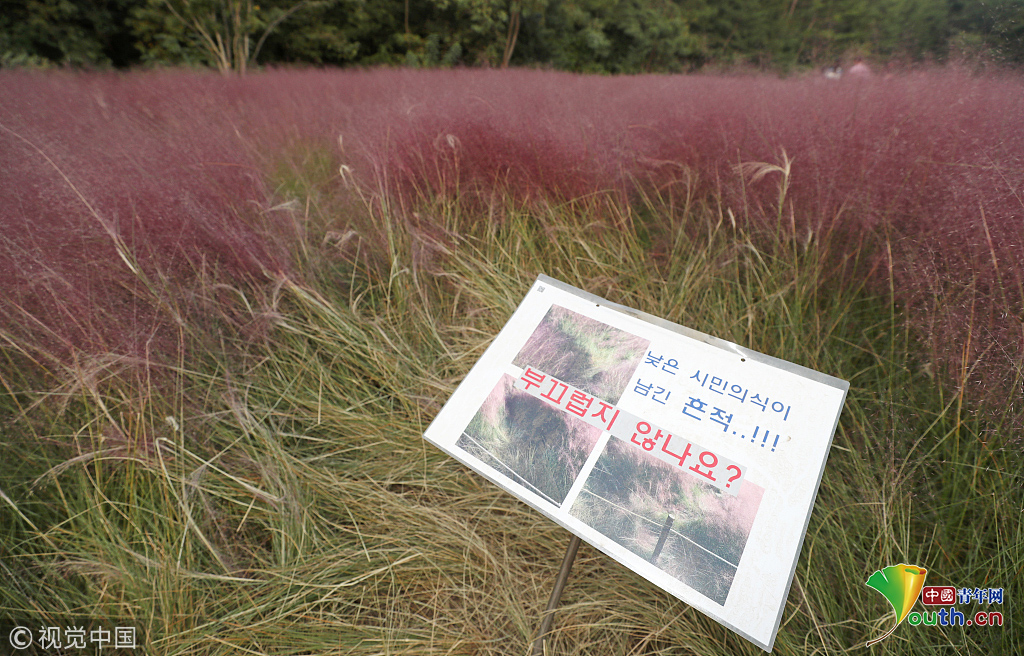 韓國蔚山,近日,蔚山公園大片粉黛亂子草盛開,但部分花海遭游客隨意踩踏。公園并沒有修復遭破壞區(qū)域,而是用繩索圍起并掛上批判性告示,呼吁游客腳下留情。圖片作者:Yonhap News Agency