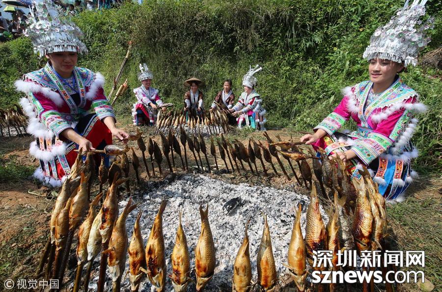 深圳新聞網(wǎng)訊 2018年9月15日,廣西柳州市融水苗族自治縣喜迎中國首屆“農民豐收節(jié)”——2018金秋燒魚季啟動儀式在桿洞鄉(xiāng)花孖苗寨舉行,數(shù)百名苗族群眾和游人共同開展了水田拔河、田間捉魚、傳統(tǒng)打谷和燒魚等活動,慶祝豐收。
