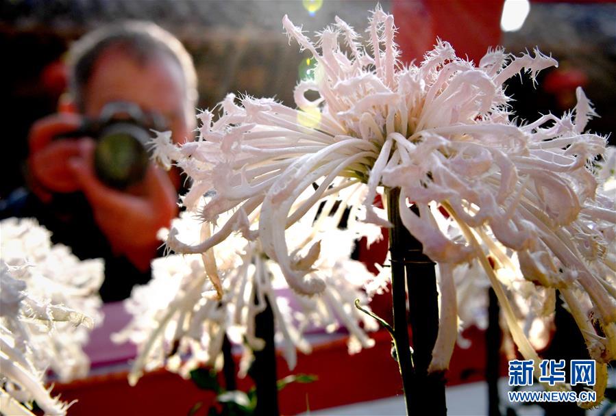 10月17日,游客在開封龍亭公園內拍攝展出的菊花。重陽時節(jié),各色菊花競相綻放,把古都開封裝點得分外秀美,吸引眾多游客前來觀賞游玩。 新華社記者 李安 攝