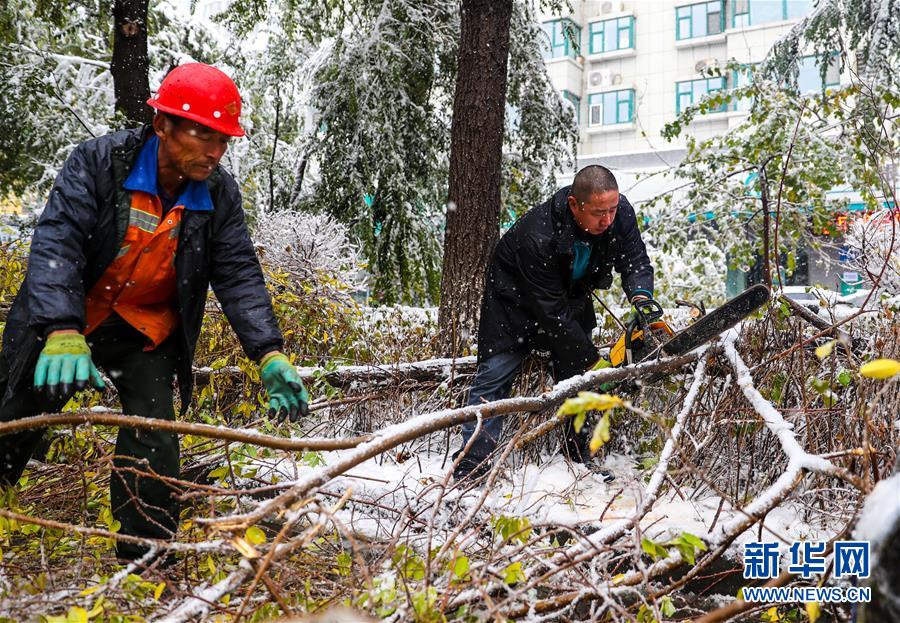 10月18日,工作人員在烏魯木齊清理被積雪壓斷的樹木。當(dāng)日,新疆烏魯木齊迎來一場降雪。 新華社記者 江文耀 攝