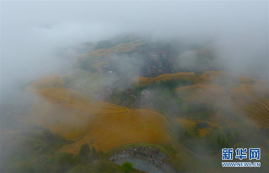 10月16日,游客在秋雨中欣賞龍脊梯田秋色(無人機(jī)拍攝)。金秋時(shí)節(jié),廣西龍勝各族自治縣龍脊梯田美如畫卷。 新華社記者 黃孝邦 攝