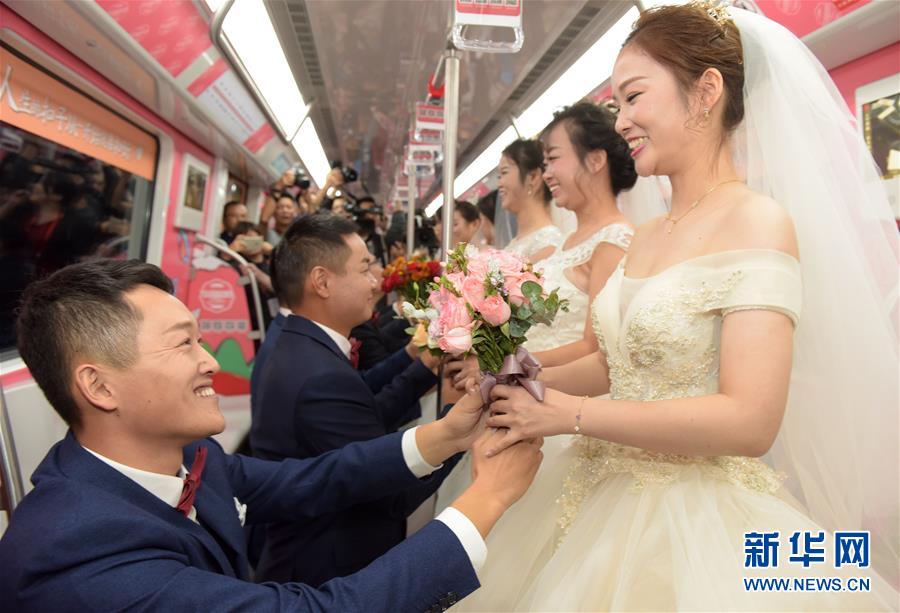 10月18日,在合肥市地鐵一號線車廂內,新郎向新娘獻花。 當日,中鐵四局集團城市軌道交通工程分公司的18對新人在安徽合肥地鐵一號線的車廂里舉行了一場集體婚禮儀式。 新華社記者 郭晨 攝