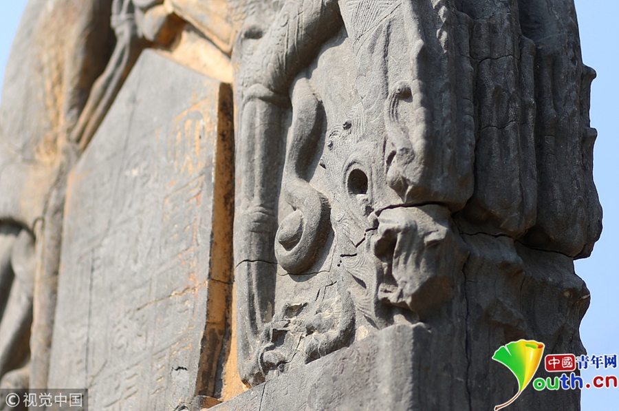 這塊唐代碑的碑額上刻寫著大唐故贈安州都督鄭府君碑,碑高2.30米,寬1.12米,厚0.27米,以整塊青石刻寫雕鑿而成,碑額兩端共有六條螭首,雕刻手法精細(xì)入微,雖歷經(jīng)1300多年風(fēng)雨的蝕侵,但依舊能看出昔日的精美。圖片來源:視覺中國
