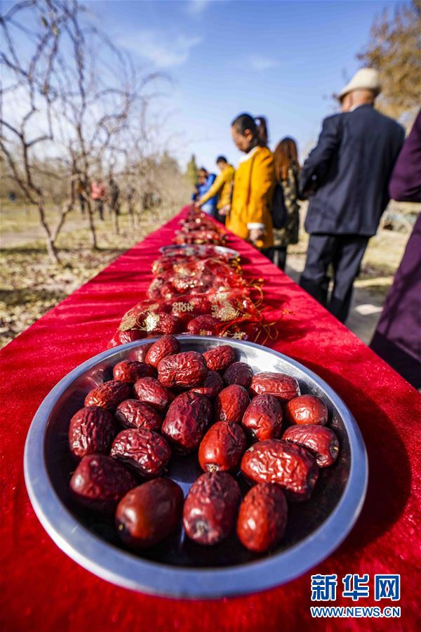10月20日,在且末縣阿熱勒鎮(zhèn)有機(jī)紅棗園里,紅棗經(jīng)銷(xiāo)商在品嘗紅棗。 新華社記者 趙戈 攝