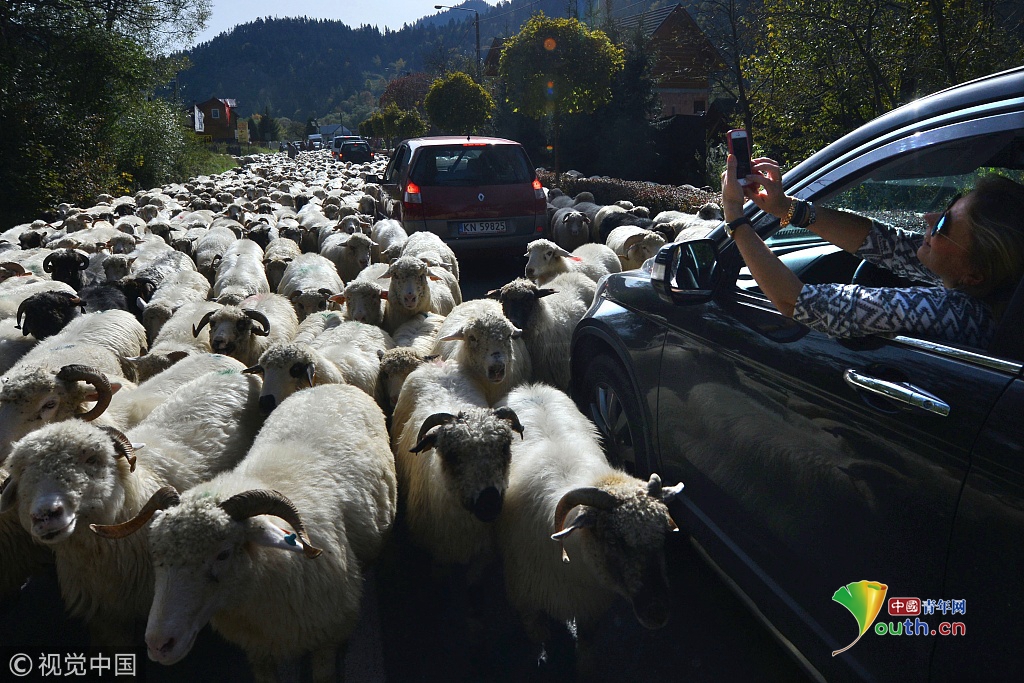 2018年9月27日訊(具體拍攝時(shí)間不詳),波蘭,浩浩蕩蕩的綿羊大軍為了趕在冬天之前回到農(nóng)場(chǎng)過(guò)冬,阻斷了鄉(xiāng)村的主車(chē)道。