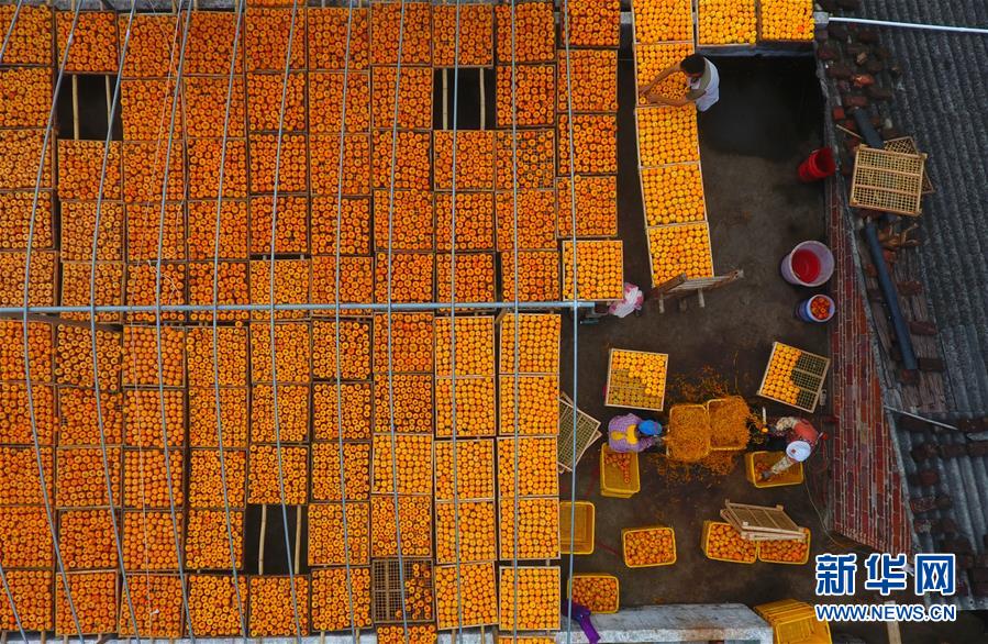 10月17日,廣西桂林市平樂縣沙子鎮(zhèn)渡河村農(nóng)民在晾曬柿子(無人機(jī)拍攝)。 金秋時節(jié),農(nóng)民們忙著收獲成熟的農(nóng)作物,喜迎豐收。 新華社記者 黃孝邦 攝