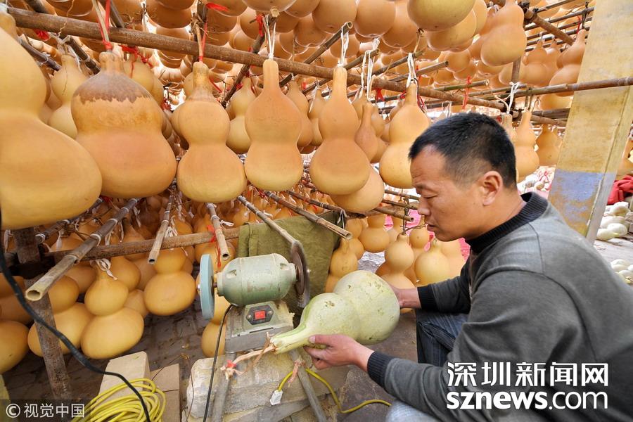 山西聞喜縣禮元鎮(zhèn)阜底村農(nóng)民趙雙慧對(duì)葫蘆進(jìn)行削皮處理。