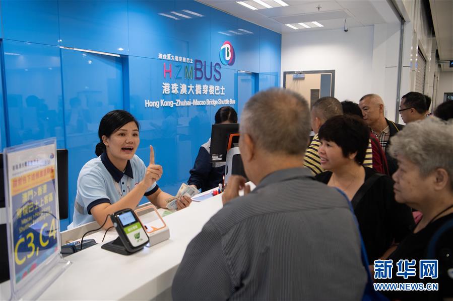 10月24日,市民在澳門(mén)離境大堂穿梭巴士售票處購(gòu)買(mǎi)車(chē)票。 當(dāng)日,港珠澳大橋正式通車(chē)。