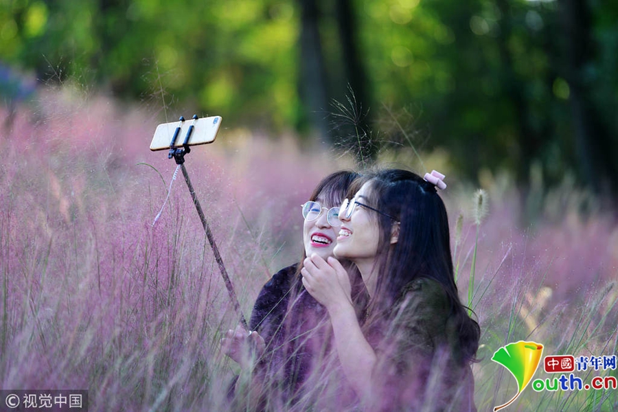 中國青年網(wǎng)北京10月7日電 2018年10月6日,游客在“粉色田野”里游玩、留影。粉黛亂子草是一種觀賞草種,該植物夏季為主要生長季,全株綠色,花期為9月中旬至11月中旬,開花時(shí),綠葉為底,粉紫色花穗如發(fā)絲從基部長出,遠(yuǎn)看如紅色云霧。