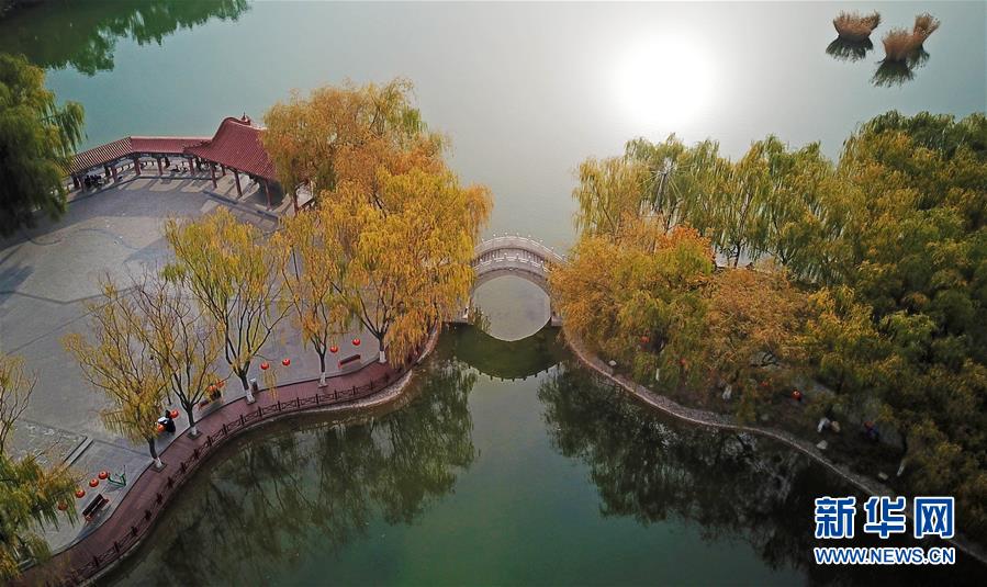 寧夏銀川市鳳凰公園秋景(10月20日無人機(jī)拍攝)。