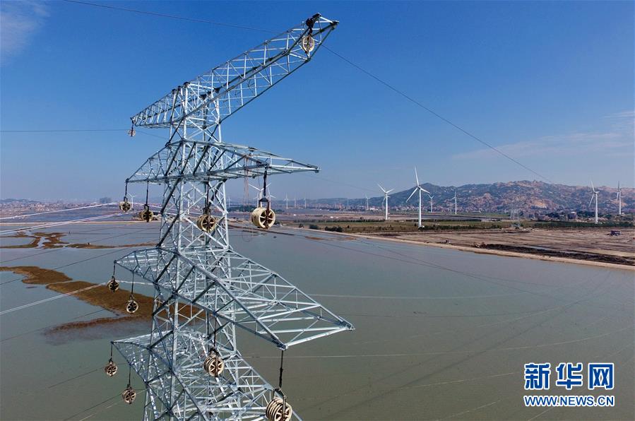 這是建在莆田平海灣上開始架線的輸送風(fēng)電鐵塔和遠(yuǎn)處的東嶠風(fēng)力發(fā)電場(10月25日無人機(jī)拍攝)。 新華社記者林善傳攝