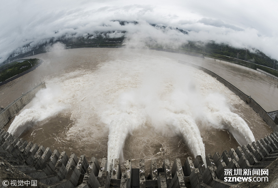 深圳新聞網訊 2018年7月5日,三峽大壩今年首次開閘泄洪。當天,三峽大壩開啟5個泄洪孔下泄洪水,至中午12點左右減至2個。
